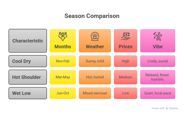 If you’re planning a trip from the US, UK, Canada, or Europe, this guide lays out when to go for the best mix of sunshine, fair prices, and the right vibe.