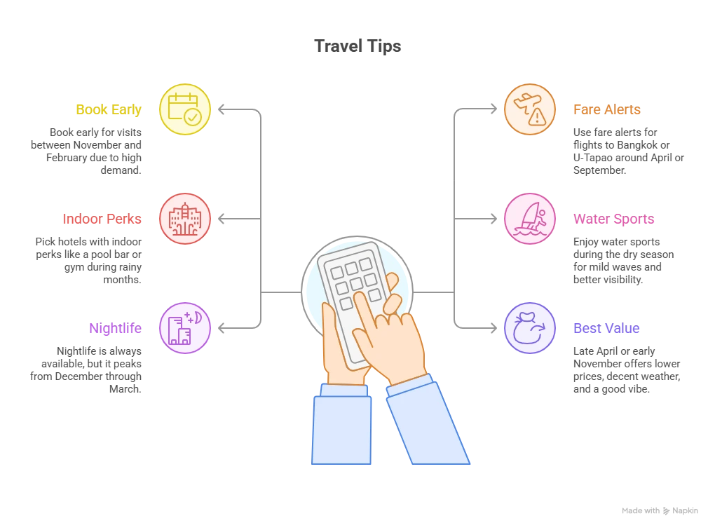 - Low season (Jun-Oct): Cheap stays, mellow energy, occasional rain. A calmer version of Pattaya worth trying.